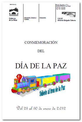 Manualidades, poesías, cuantos, canciones, lecturas, debates,... son algunas de las actividades que planteamos en nuestro colegio para la Semana de la Paz, que se desarrolla en el centro entres los días 23 y 30 de enero de 2012.La celebración culminará el lunes 30 a las 15 horas con una acto en el patio donde toda la Comunidad Educativa formaremos el TREN DE LA PAZ. Este acto podrá ser suspendido si la climatología no acompaña, es decir, en caso de lluvia, nieve o mucho frío. Aquí puedes descargar el programa. ![]() |