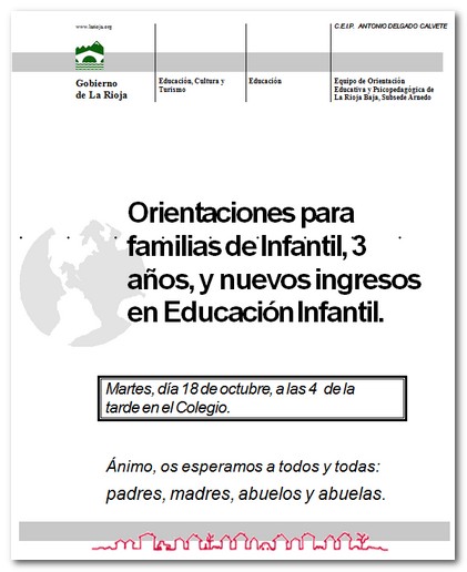El Equipo de Orientación de nuetro colegio pone a vuestra disposición diversos materiales para los padres y madres de alumnos/as de Educación Infantil (3 años). Todos ellos han sido tratados en la reunión de orientación celebrada hace unos días. A continuación se puede acceder a estos materiales: